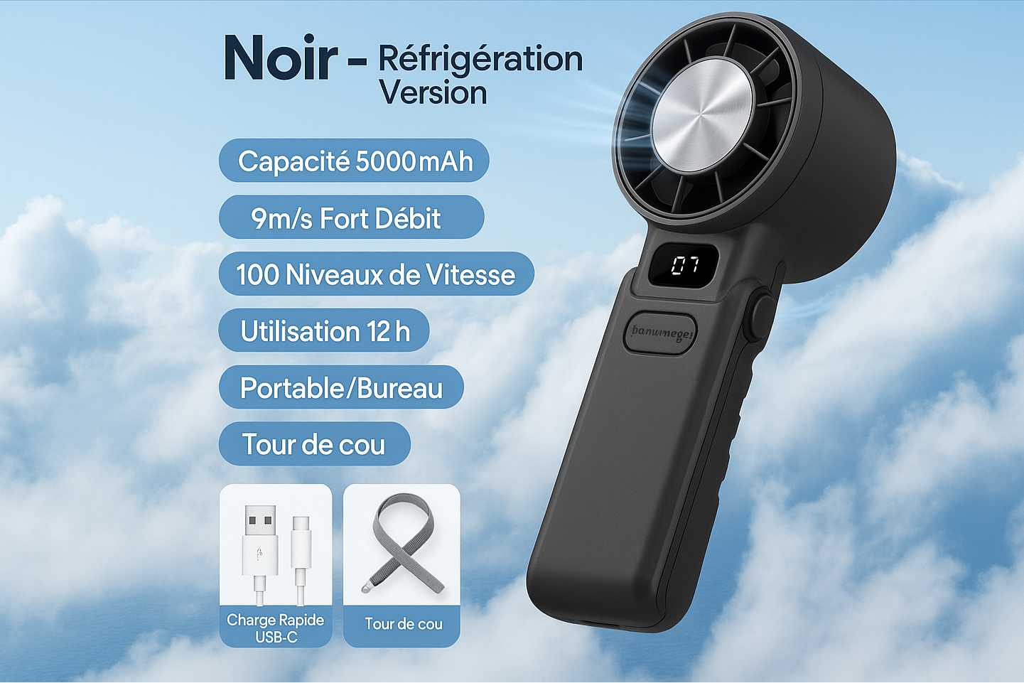 🔋 Autonomie Exceptionnelle - Batterie 3600mAh pour des heures de fraîcheur 🎒 Design Ultra-Compact - Se glisse facilement dans votre poche